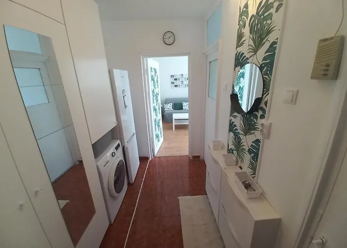 The apartment includes a fully equipped kitchen with air conditioning and a washing machine for utmost comfort.